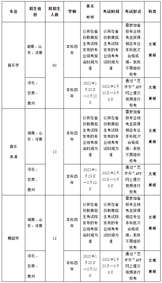 (一)河北、甘肃、贵州省音乐、舞蹈类考生须参加我校组织的校考且取得合格证;湖南、山东、河南省的音乐、舞蹈类考生须参加省级专业统考并成绩合格。所有考生还需参加全国普通高考文化课统一考试,方可填报我校音乐、舞蹈类专业志愿。